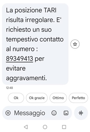 Malintenzionati stanno inviando messaggi per una fittizia posizione TARI irregolare chiedendo di contattare un numero telefonico.