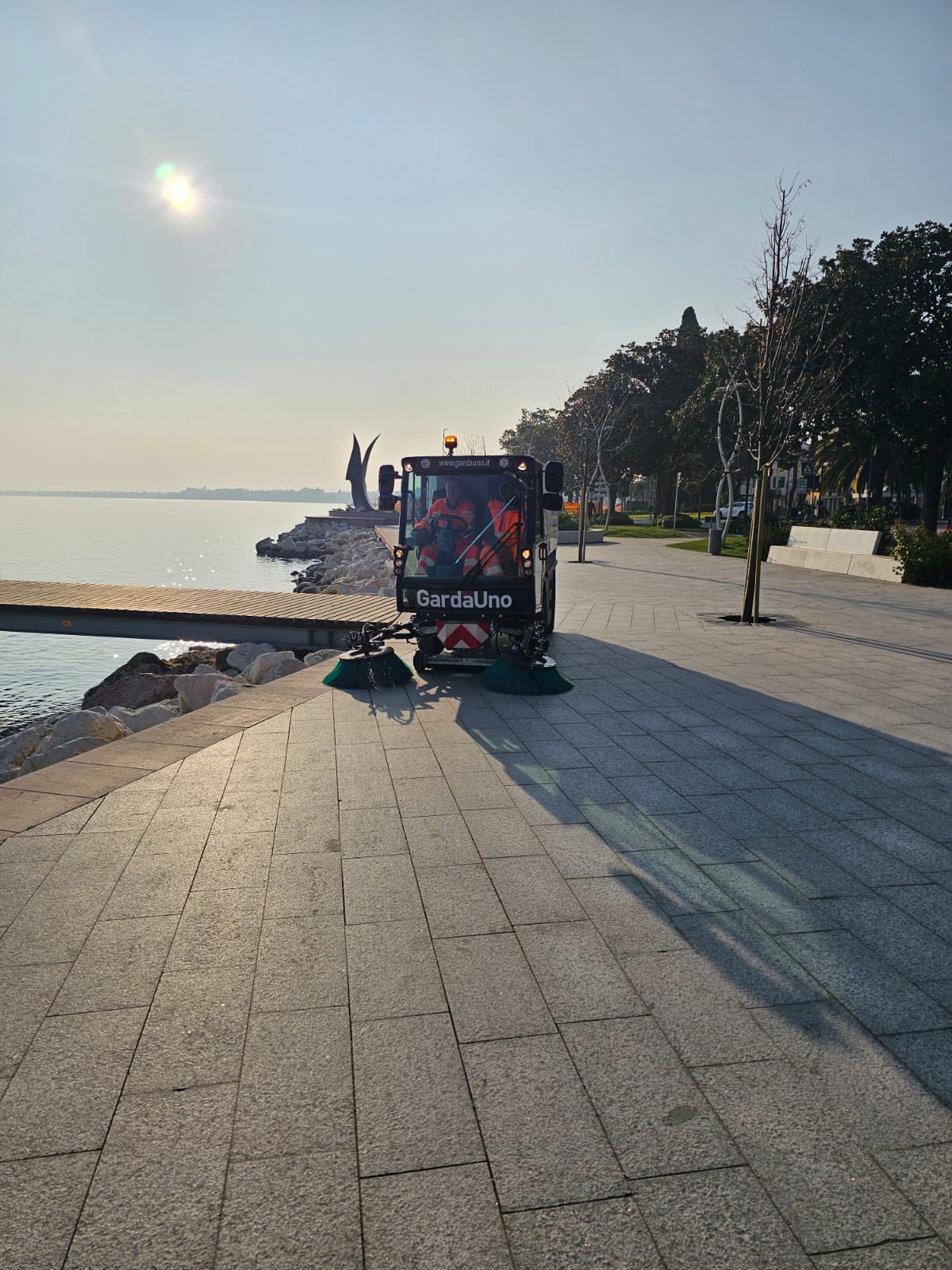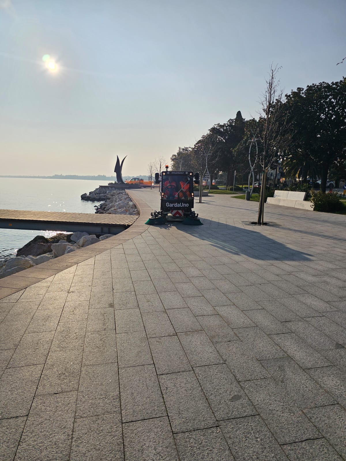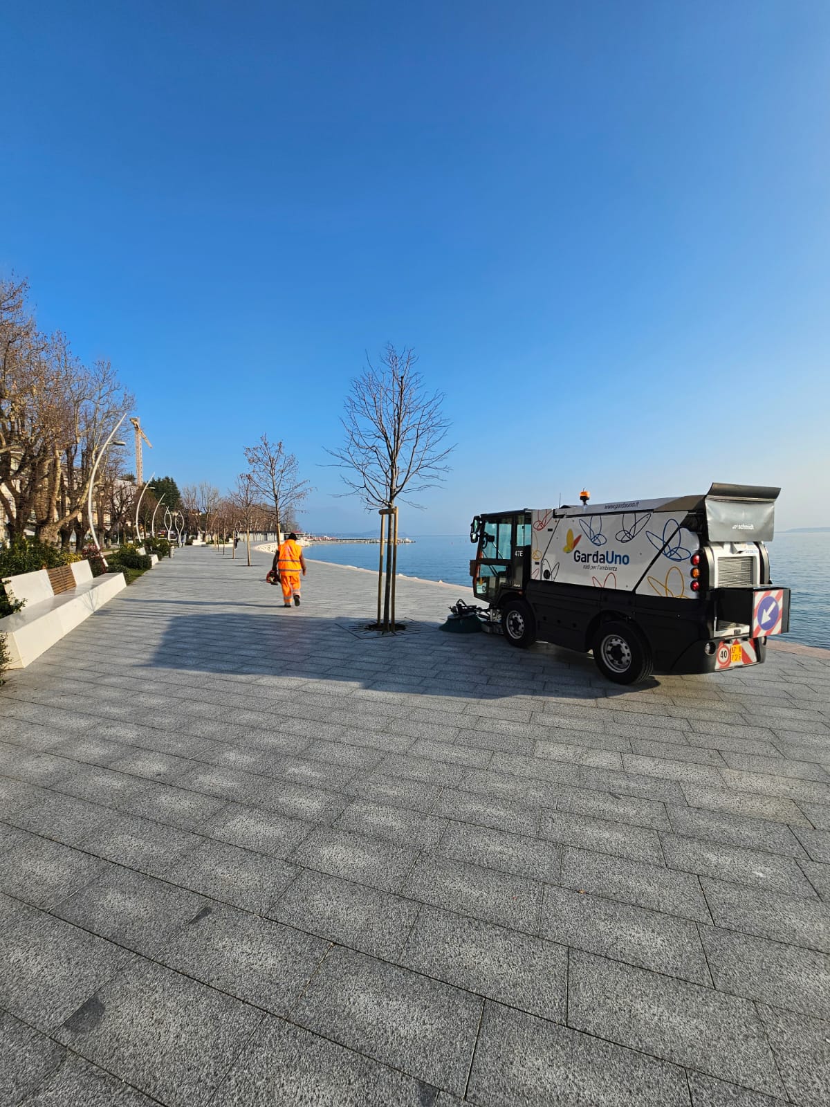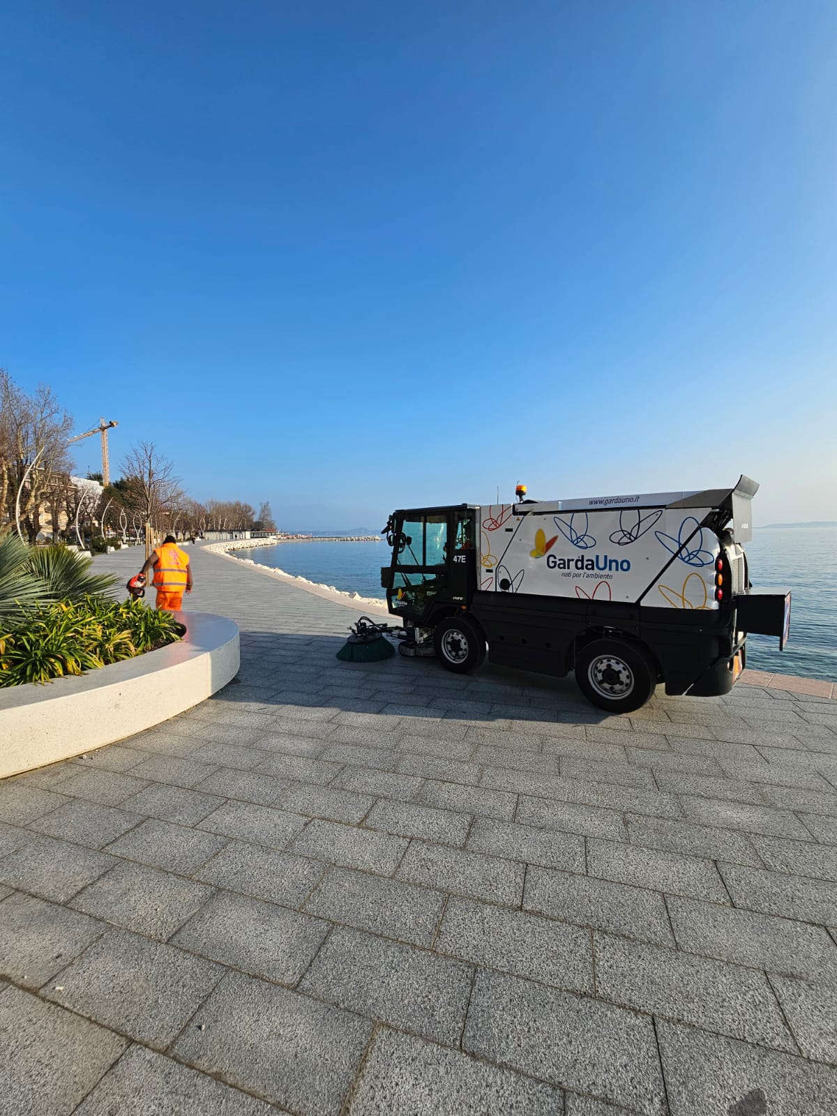 La scelta di una spazzatrice da 2 m³ non è casuale. Uno spazio urbano come quello di Desenzano — fatto di vicoli stretti, zone pedonali e tavolini all’aperto — richiede un mezzo che sappia muoversi con agilità, senza tuttavia rinunciare all’efficacia. Questa spazzatrice rappresenta il giusto equilibrio: dimensioni ridotte per infilarsi senza difficoltà tra le vie interne del centro, ma capacità di carico sufficiente per lavorare a lungo senza tante interruzioni. Il cassone con una simile capacità, infatti, permette di mantenere un ritmo costante senza dover svuotare il carico di continuo.